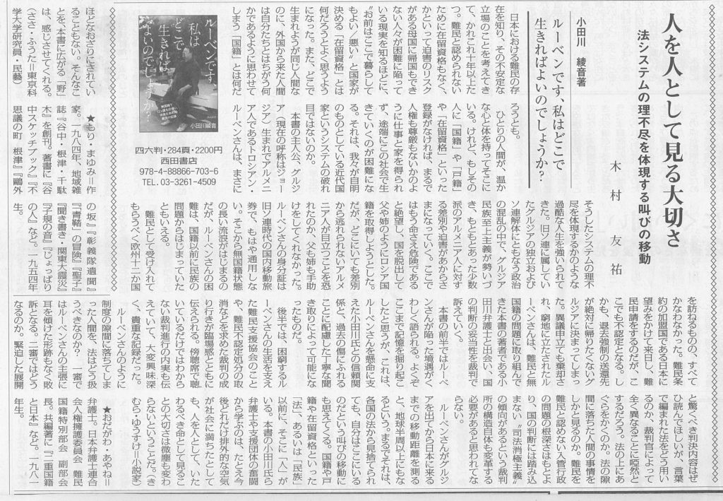 『ルーベンです、私はどこで生きればよいのでしょうか?』(小田川綾音著)が週刊読書人(2025年8月15日号)に書評が掲載されました。
